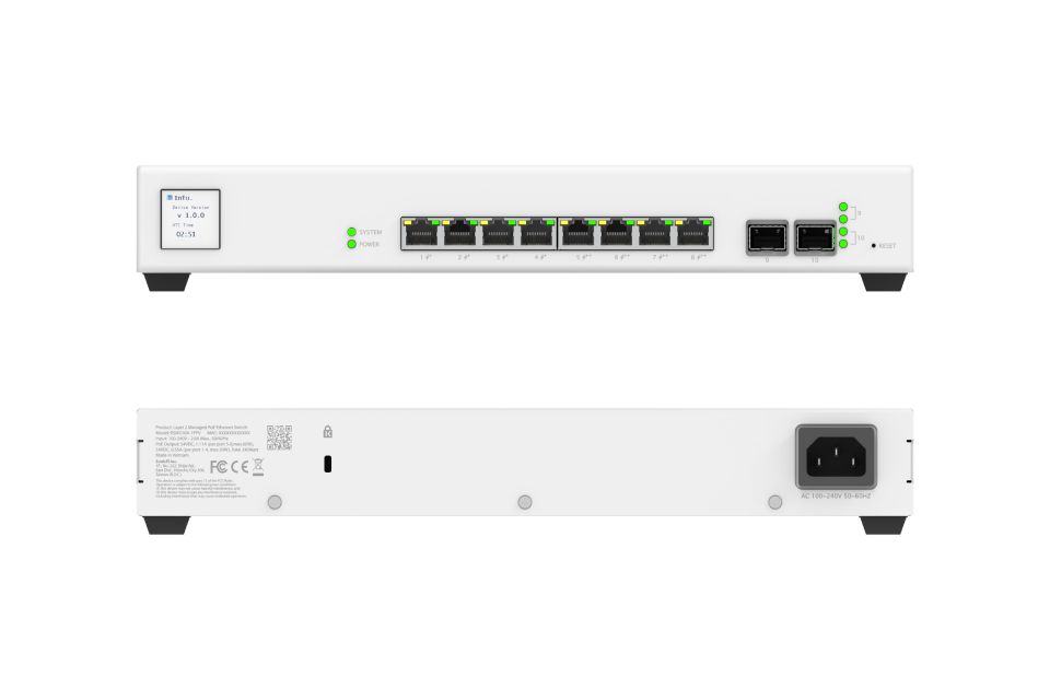 • The built-in display provides real-time system diagnostics and PoE usage stats, allowing on-site staff to perform reboots or resets directly from the device.