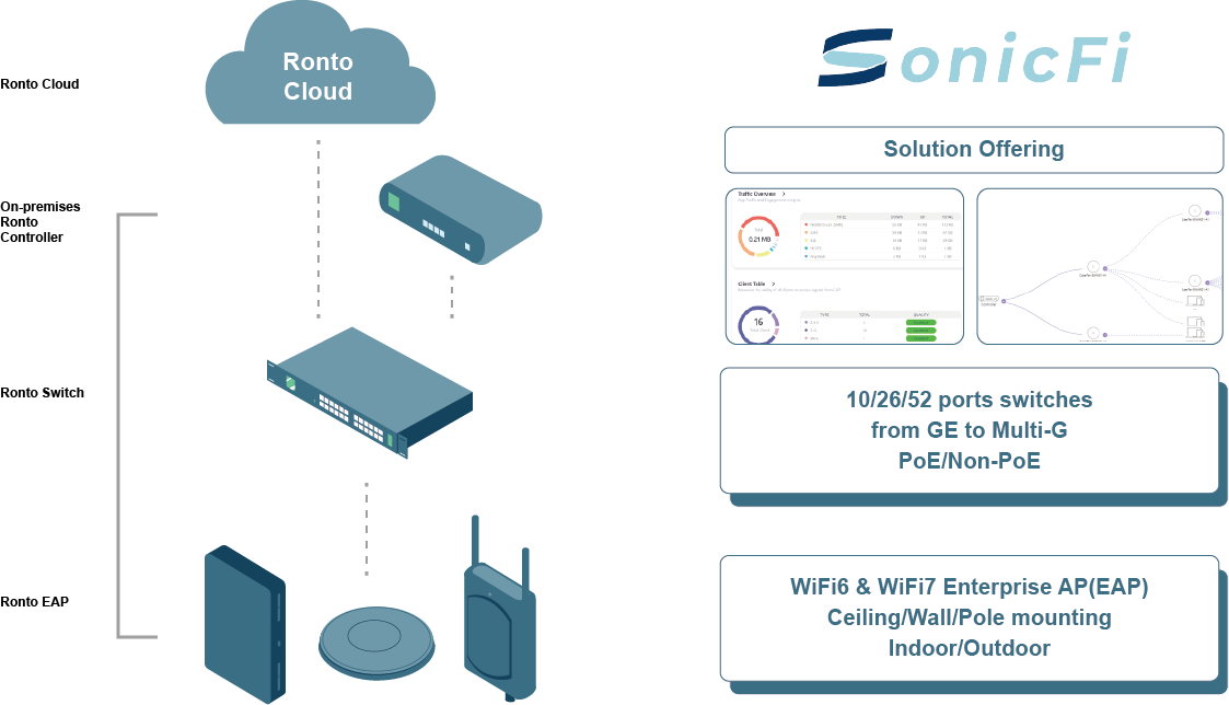 Ronto Enterprise Solution is a communication solution developed by SoniciFi for small and medium-sized business customers. This solution comprises four SoniciFi product portfolios : WiFi EAP, Ethernet switches, on-premises gateways, and cloud control software. The solution emphasizes simple installation, contactless setup, uninterrupted troubleshooting, and automated provisioning to achieve an optimal user experience. The entire system, from the center to the edge, is equipped with AI-powered mechanisms. These software sensors transmit network conditions from all corners back to the gateways and control software, rapidly calculating and then sending optimal network settings back to each device for adjustment. System management can be divided into on-premises controllers and various cloud-based management options, meeting the deployment and operational needs of small to medium-sized business scenarios.