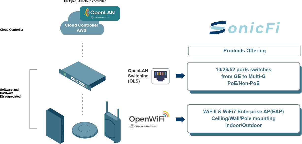 The TIP OpenLAN solution is built-moving away from closed, proprietary systems toward open and disaggregated architectures based on the software defined by the Telecom Infra Project (TIP) OLS open source community. This solution combines SonicFi’s complete product portfolios and the diverse device software as well as cloud control systems from various vendors to form network deployment solutions suitable for various medium to large-scale customer scenarios.